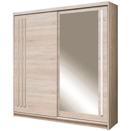 Szafa Sys Effect 200 to eleganckie i praktyczne rozwiązanie do każdej nowoczesnej sypialni. Wykonana z wysokiej jakości płyty wiórowej laminowanej w kolorze sonoma, łączy trwałość z minimalistycznym designem, który łatwo dopasować do różnych aranżacji wnętrz. Matowe wykończenie nadaje szafie subtelnej elegancji, a wbudowane lustro sprawia, że przestrzeń optycznie się powiększa i ułatwia codzienne przygotowania.