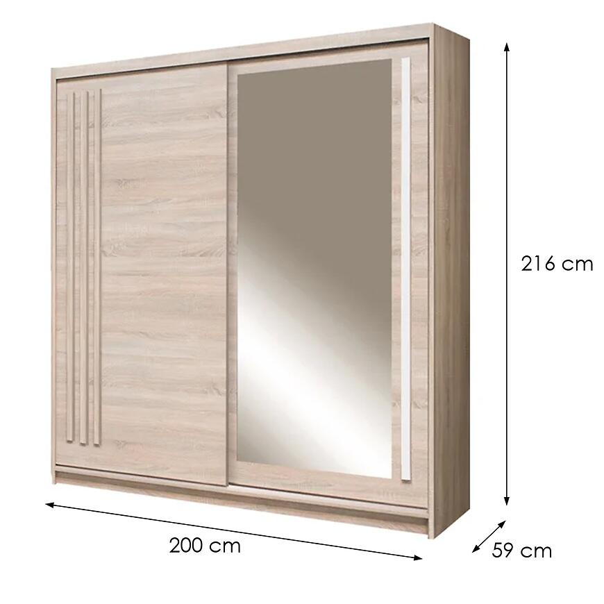 Szafa posiada dwudrzwiowe drzwi przesuwne, które oszczędzają miejsce w pomieszczeniu i umożliwiają wygodny dostęp do zawartości. Dzięki wymiarom 200 cm szerokości, 216 cm wysokości i 59 cm głębokości, szafa oferuje dużą przestrzeń do przechowywania ubrań, akcesoriów i obuwia. Przemyślana konstrukcja pozwala na uporządkowanie garderoby w sposób wygodny i przejrzysty.