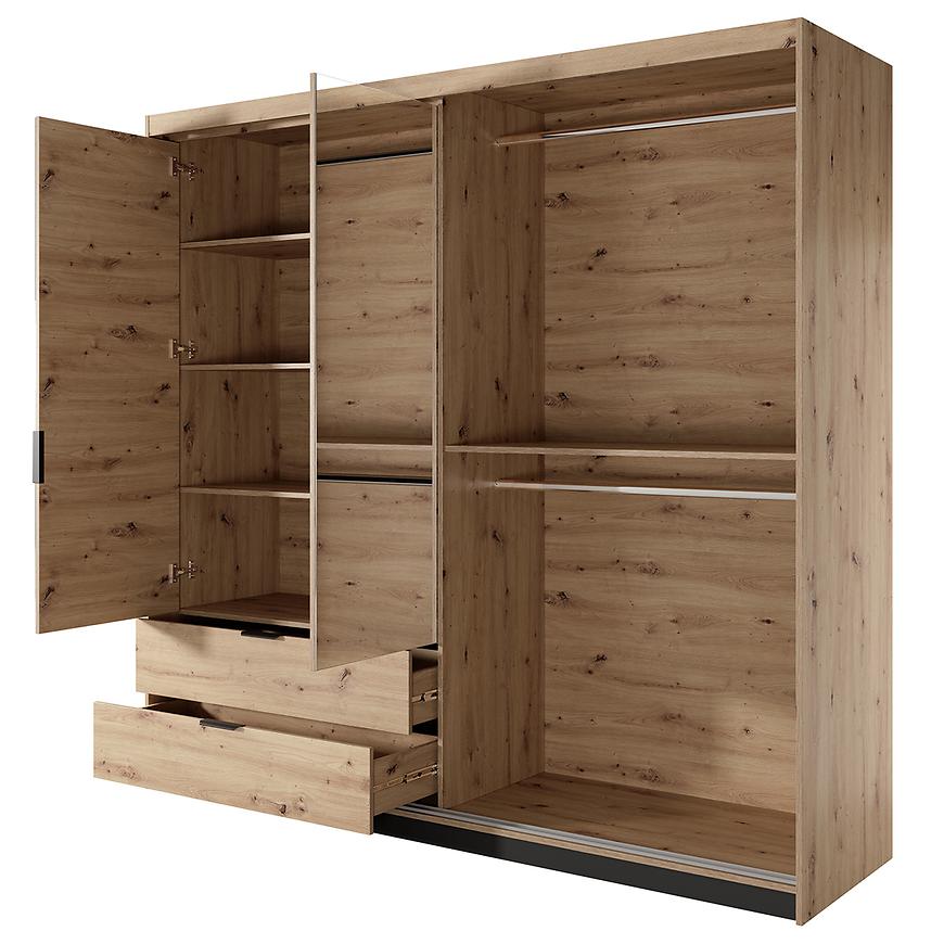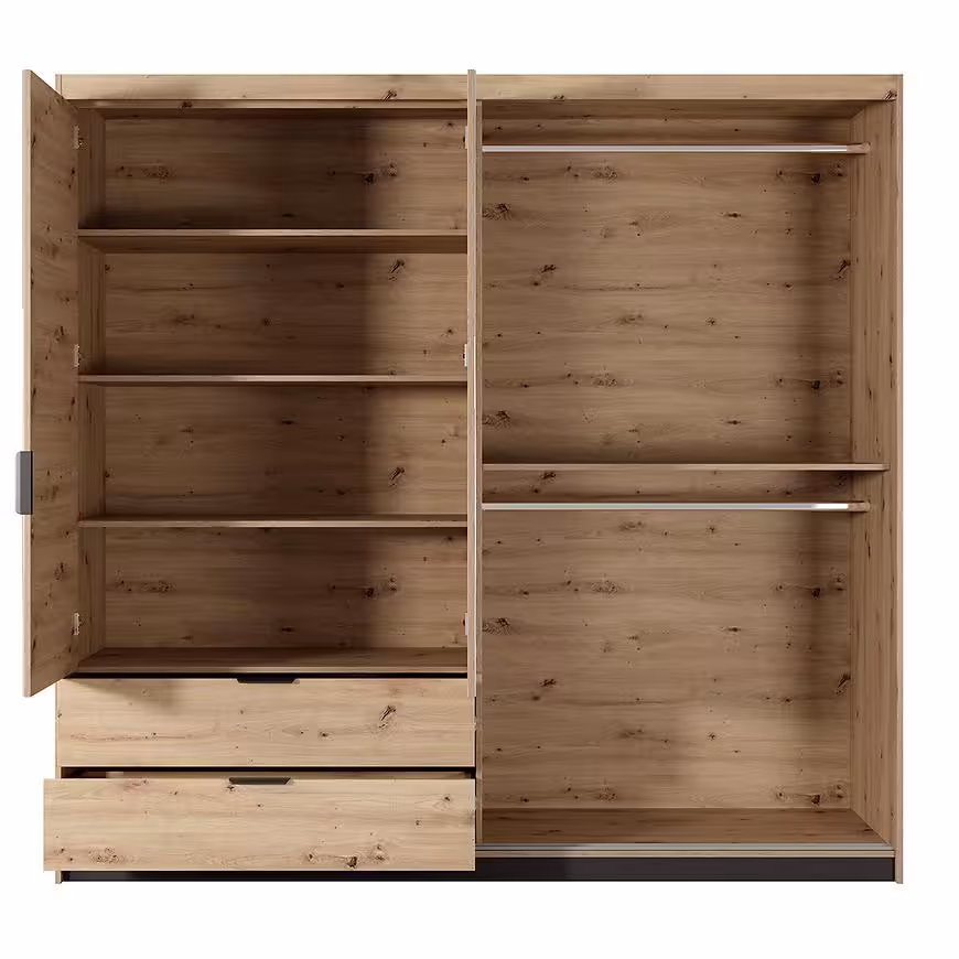 Szafa wyposażona jest w kilkudrzwiowe drzwi, które mogą być przesuwne lub uchylne, co pozwala na dostosowanie sposobu otwierania do indywidualnych preferencji i potrzeb użytkownika. Dodatkowo, 2 szuflady umożliwiają przechowywanie drobniejszych przedmiotów, zapewniając porządek i organizację wewnątrz szafy.
