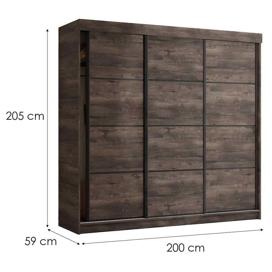 Szafa Tanger 200 o wymiarach 200 cm szerokości, 205 cm wysokości i 59 cm głębokości zapewnia dużą powierzchnię do przechowywania przy zachowaniu kompaktowych wymiarów. Trzy przesuwne drzwi umożliwiają łatwy dostęp do całego wnętrza, a brak lustra na froncie pozwala utrzymać eleganckie, matowe wykończenie w kolorze Jesion Ciemny. Konstrukcja z płyty wiórowej laminowanej gwarantuje trwałość, odporność na codzienne użytkowanie i łatwość w utrzymaniu czystości.