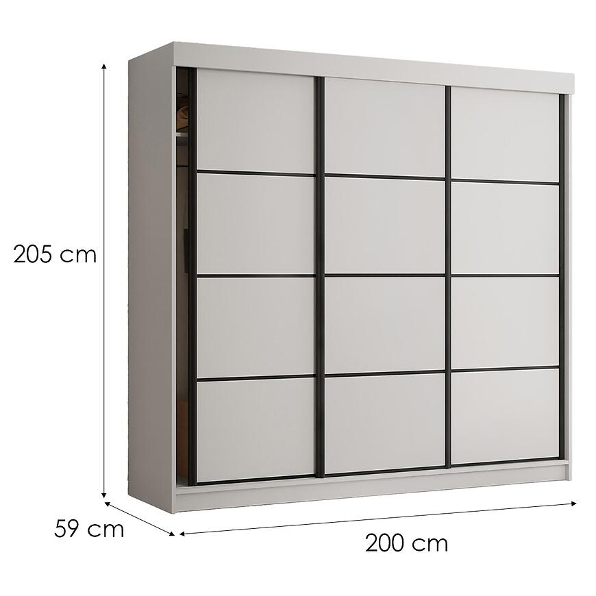 Szafa Tanger 200 o wymiarach 200 cm szerokości, 205 cm wysokości i 59 cm głębokości oferuje dużą pojemność, zachowując kompaktową formę. Trzy przesuwne drzwi gwarantują łatwy dostęp do całego wnętrza, a brak lustra na froncie pozwala zachować spójność estetyczną i eleganckie, matowe wykończenie w kolorze Kaszmir. Konstrukcja z płyty wiórowej laminowanej zapewnia trwałość, odporność na codzienne użytkowanie i łatwość w utrzymaniu czystości.