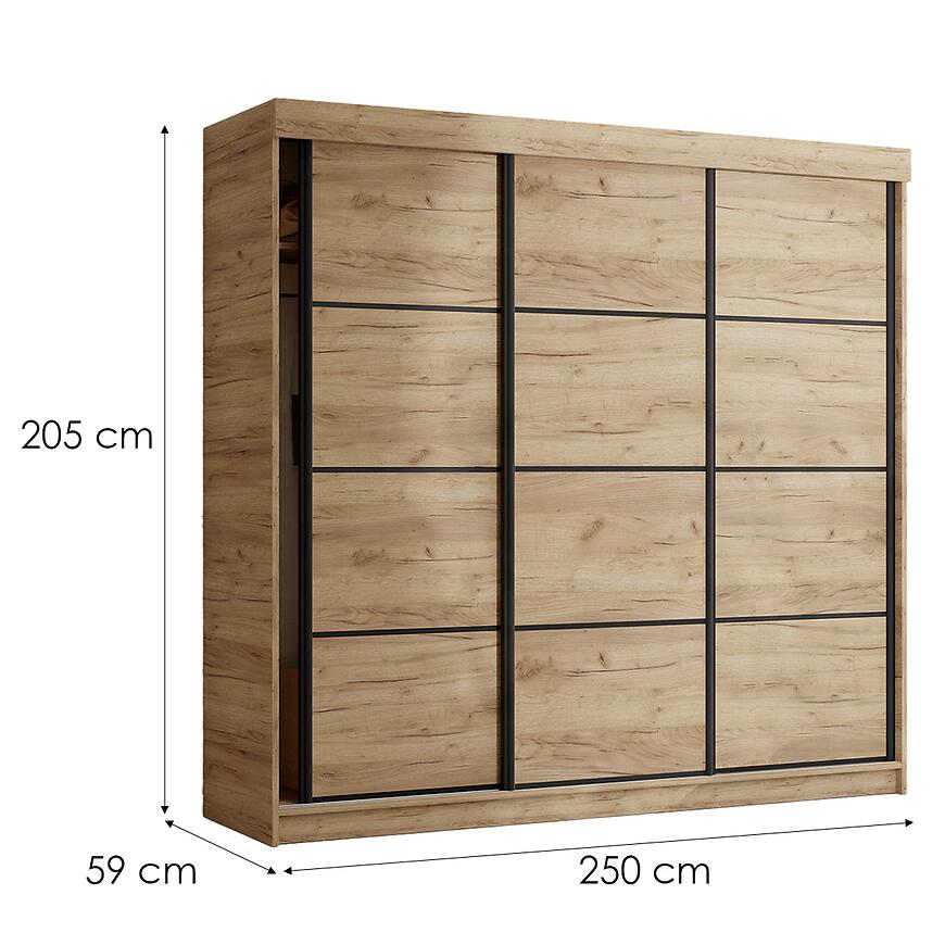 Szafa Tanger 250 cm została wyposażona w trzy drzwi przesuwne, które zapewniają komfort użytkowania i umożliwiają swobodny dostęp do wnętrza mebla bez konieczności pozostawiania dodatkowej przestrzeni na otwieranie skrzydeł. Dzięki temu szafa doskonale sprawdza się także w pomieszczeniach, w których liczy się maksymalne wykorzystanie dostępnej powierzchni. Wnętrze szafy zaprojektowano z myślą o wygodnym przechowywaniu odzieży oraz akcesoriów. Mebel posiada praktyczne półki oraz drążek na ubrania, które umożliwiają uporządkowane rozmieszczenie odzieży wiszącej, składanych elementów garderoby oraz dodatków. Przemyślany układ wnętrza ułatwia segregację ubrań sezonowych oraz codziennych stylizacji. Wymiary szafy – 250 cm szerokości, 205 cm wysokości oraz 59 cm głębokości – zapewniają dużą pojemność, pozwalając na wygodne przechowywanie dużej ilości odzieży przy zachowaniu ergonomii użytkowania.