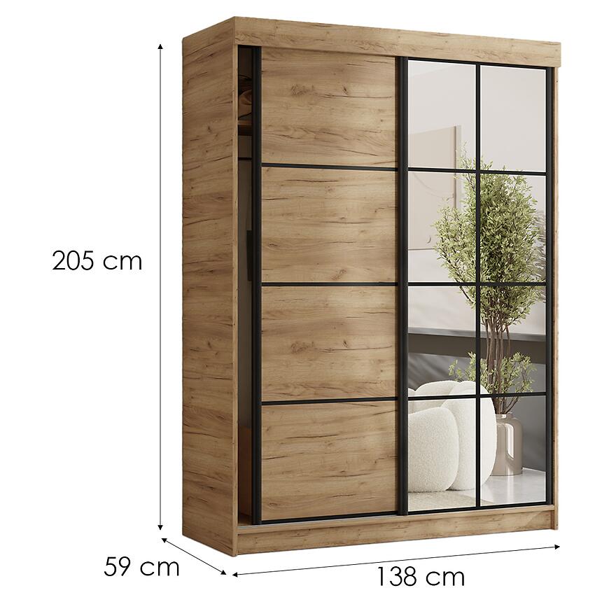 Szafa Tanger 138 w kolorze Dąb Craft Złoty z lustrem to funkcjonalny i estetyczny mebel, który doskonale sprawdzi się w sypialni, garderobie, przedpokoju lub pokoju młodzieżowym. Model o szerokości 138 cm, wysokości 205 cm i głębokości 59 cm oferuje dużą przestrzeń do przechowywania ubrań, dodatków oraz tekstyliów domowych. Ciepły odcień Dąb Craft Złoty inspirowany naturalnym drewnem nadaje wnętrzu przytulności i elegancji, a lustro umieszczone na froncie optycznie powiększa przestrzeń oraz rozjaśnia pomieszczenie.