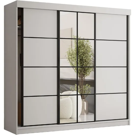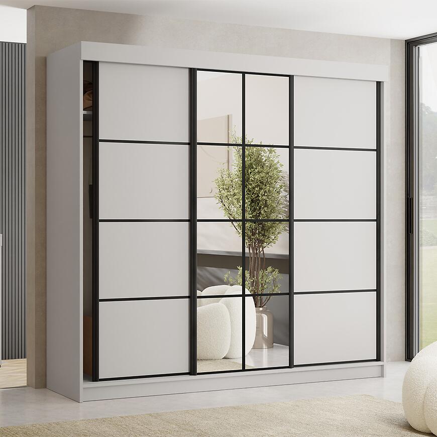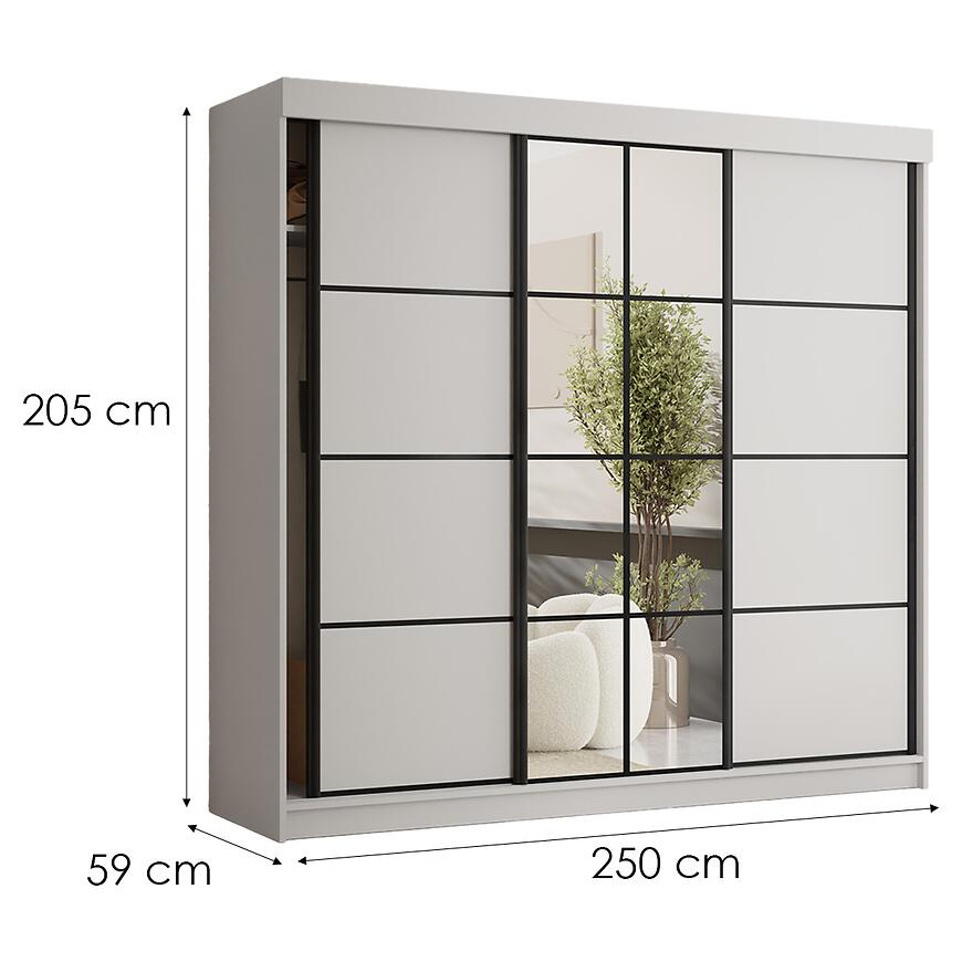 Szafa Tanger 250 cm została wyposażona w trzy drzwi przesuwne, w tym centralne drzwi z lustrem, co zapewnia wygodny dostęp do całego wnętrza mebla bez potrzeby dodatkowej przestrzeni na otwieranie skrzydeł. Wnętrze szafy zaprojektowano z myślą o komfortowej organizacji garderoby. Szafa posiada praktyczne półki oraz drążek na ubrania, umożliwiające wygodne rozmieszczenie odzieży wiszącej, składanej i akcesoriów. Wymiary szafy – 250 cm szerokości, 205 cm wysokości oraz 59 cm głębokości – zapewniają dużą pojemność, a wbudowane lustro dodatkowo zwiększa funkcjonalność i wygodę codziennego użytkowania.