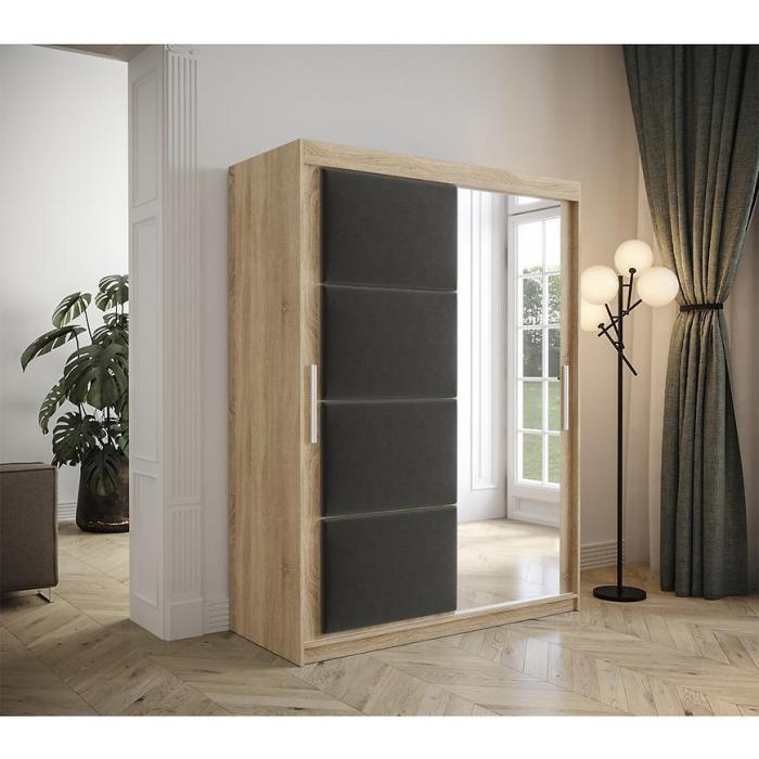 Wygląd szafy Tapi zachwyci każdego zwolennika klasycznego, a zarazem ciekawego stylu. Szafa posiada wystarczającą ilość miejsca na ubrania oraz na inne przedmioty. Jest to niezbędny element wyposażenia w każdym domu, garderobie czy przedpokoju. Materiał wykonania to płyta wiórowa laminowana.