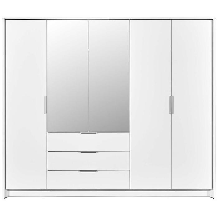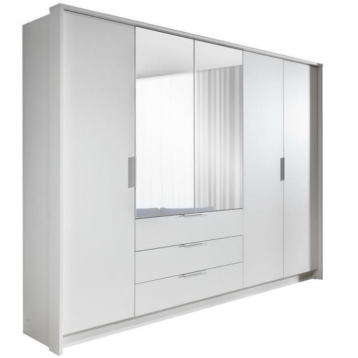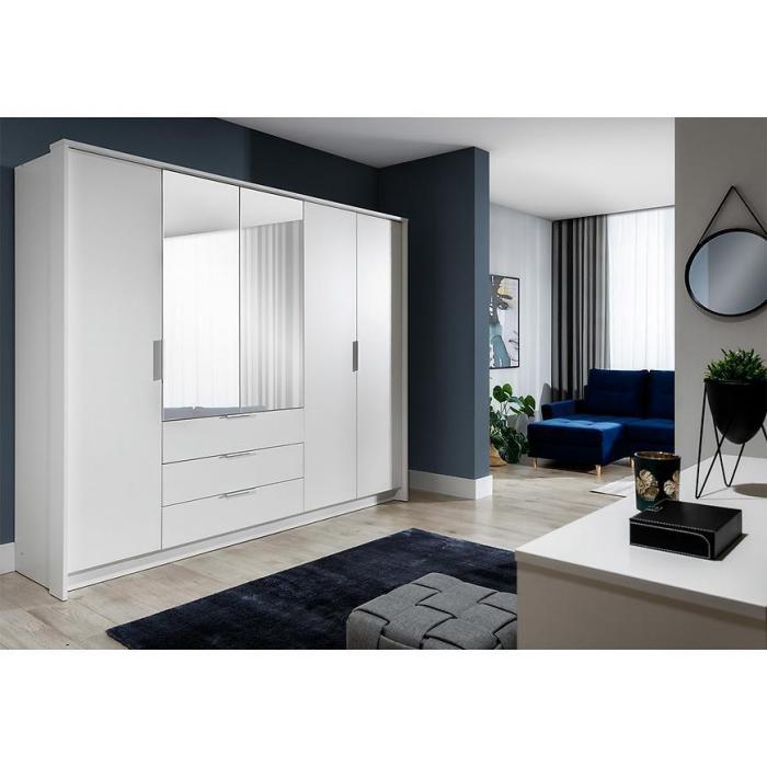 Szafa z uchylnymi drzwiami w kolorze białym z kolekcji Togo to doskonała propozycja do pokoju dziennego, ale znajdzie swoje miejsce również w innym pomieszczeniu, jak na przykład w przedpokoju czy garderobie, sypialni.Szafa posiada półki, drążek na ubrania oraz trzy szyflady. Pojemna szafa Togo posiada lustro, które sprawi, że pomieszczenie stanie się optycznie większe. Wygląd szafy sprawi, że wpasuje się w większość aranżacji. Szafa będzie świetnym miejscem do wieszania ubrań. Materiał wykonania to płyta wiórowej laminowanej.