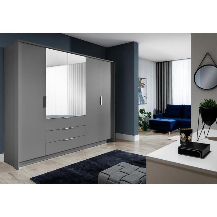 Szafa z uchylnymi drzwiami w kolorze grafit z kolekcji Togo to doskonała propozycja do pokoju dziennego, ale znajdzie swoje miejsce również w innym pomieszczeniu, jak na przykład w przedpokoju czy garderobie, sypialni. Szafa posiada półki, drążek na ubrania oraz trzy szuflady. Pojemna szafa Togo posiada lustro, które sprawi, że pomieszczenie stanie się optycznie większe. Wygląd szafy sprawi, że wpasuje się w większość aranżacji. Szafa będzie świetnym miejscem do wieszania ubrań. Materiał wykonania to płyta wiórowej laminowanej.