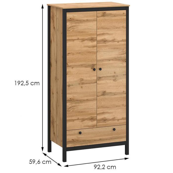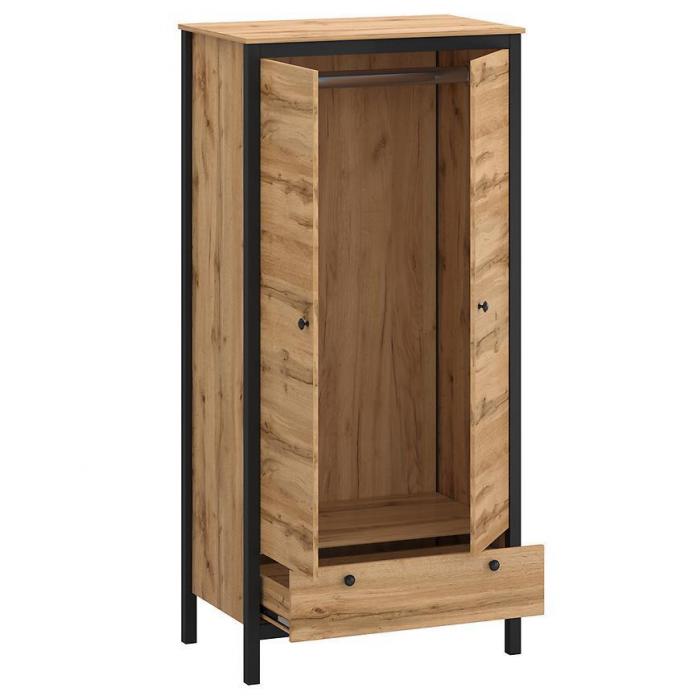 Szafa na ubrania Palmer z uchylnymi drzwiami to praktyczny mebel do salonu, pokoju dziennego czy przedpokoju. Szafa sprawdzi się również w innym pomieszczeniu. Kolor mebla dąb wotan/czarny wpasuje się w wiele aranżacji. Będzie pasowała do wnętrz klasycznych jak również do wnętrz nowoczesnych - szafa z pewnością sprawdzi się w danym pomieszczeniu. Mebel posiada szufladę oraz drążek do wieszania ubrań, na którym powiesisz nawet długie ubrania. Płyta laminowana to płyta, z której wykonana jest szafa. Do szafy na ubrania można dokupić inne meble z kolekcji.