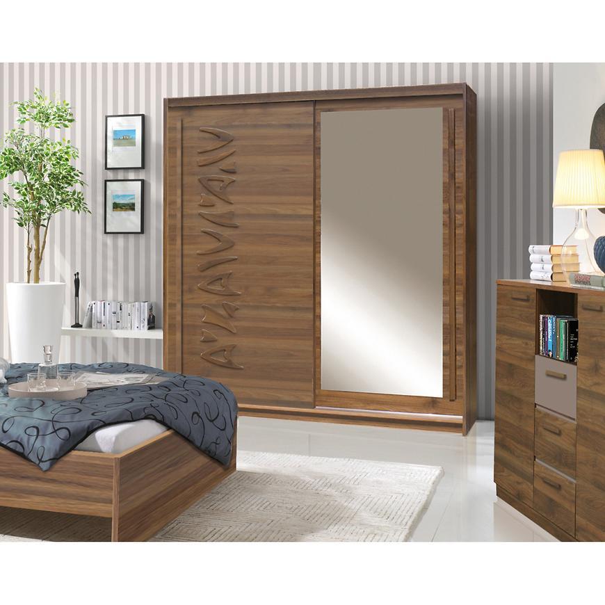 Szafa z przesuwanymi drzwiami w kolorze orzech colombia z kolekcji Tokyo to doskonała propozycja do pokoju dziennego, ale znajdzie swoje miejsce również w innym pomieszczeniu, jak na przykład w przedpokoju czy garderobie, sypialni. Pojemna szafa Tokyo posiada lustro, które sprawi, że pomieszczenie stanie się optycznie większe. Wygląd szafy sprawi, że wpasuje się w większość aranżacji. Szafa będzie świetnym miejscem do wieszania ubrań. Materiał wykonania to płyta MDF.