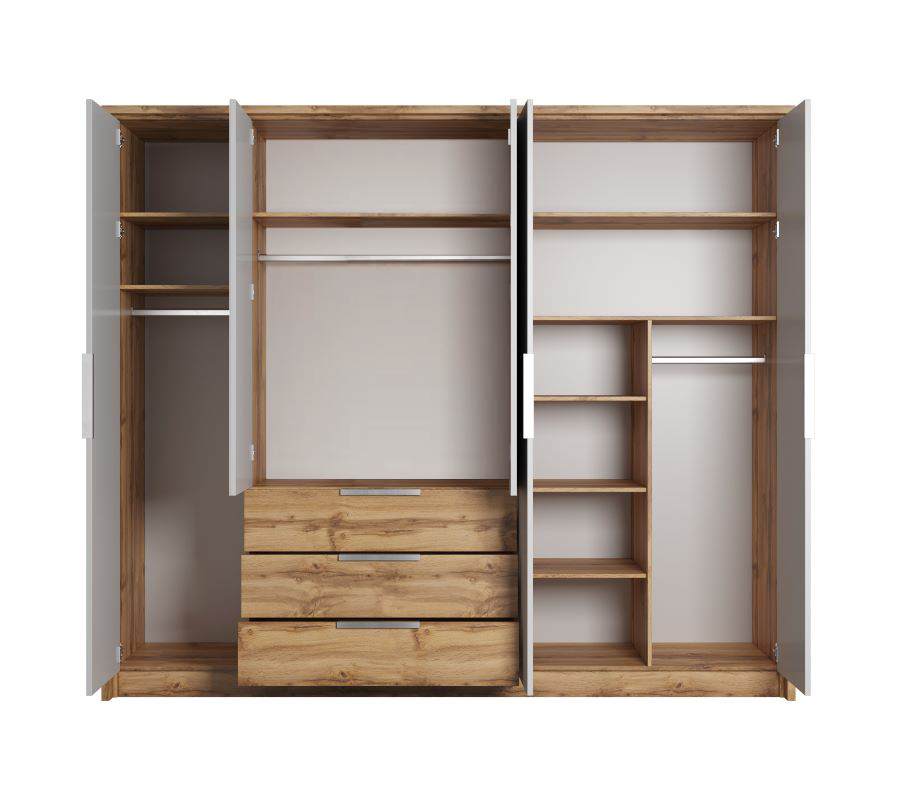 Szafa z uchylnymi drzwiami w kolorze biały mat/dąb wotan z kolekcji Tony to doskonała propozycja do pokoju dziennego, ale znajdzie swoje miejsce również w innym pomieszczeniu, jak na przykład w przedpokoju czy garderobie, sypialni. Materiał wykonania to płyta wiórowej laminowanej. Korpus szafy Tony 255 oraz szuflady wykonane w dekorze dąb wotan. Fronty białe matowe, środkowe drzwi z lustrami. Drzwi otwierane. Szafa w standardzie posiada trzy szuflady. Bardzo pojemne i funkcjonalne wnętrze szafy. System półek oraz drążek, pozwala na praktyczne zagospodarowanie przestrzeni. Uchwyty wykonane z aluminium. Szafa przeznaczona do samodzielnego montażu. Wygląd szafy sprawi, że wpasuje się w większość aranżacji. Szafa będzie świetnym miejscem do wieszania ubrań.