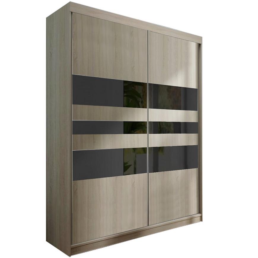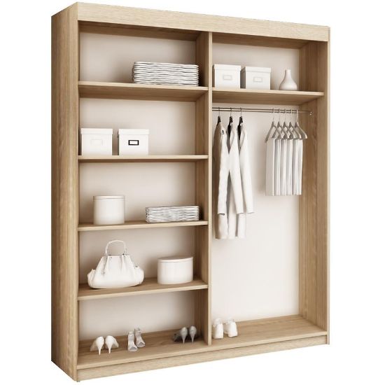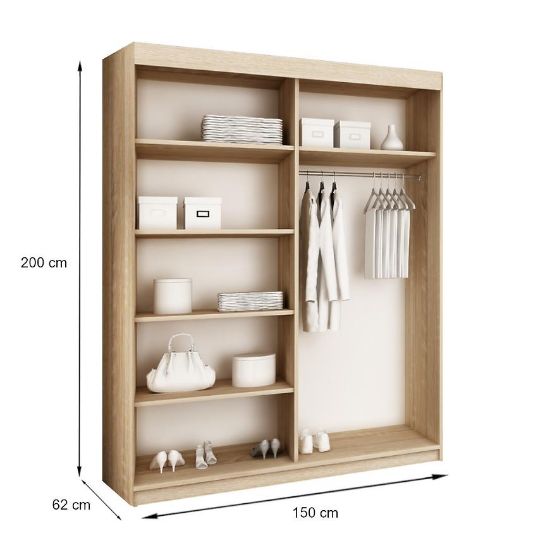 Z szerokością 150 cm, ta dwudrzwiowa szafa z drzwiami przesuwnymi doskonale łączy funkcjonalność z estetyką. Fronty szafy wyróżniają się nie tylko matowym wykończeniem, ale także dekorem umieszczonym na froncie, co dodaje meblowi niepowtarzalnego charakteru. Wzór dębu sonoma sprawia, że szafa staje się nie tylko praktycznym miejscem do przechowywania, ale także estetycznym elementem wnętrza. Szafa Top 17 została zaprojektowana z myślą o maksymalnej funkcjonalności. Dwudrzwiowe drzwi przesuwne pozwalają na oszczędność miejsca, a jednocześnie ułatwiają dostęp do przechowywanych rzeczy.