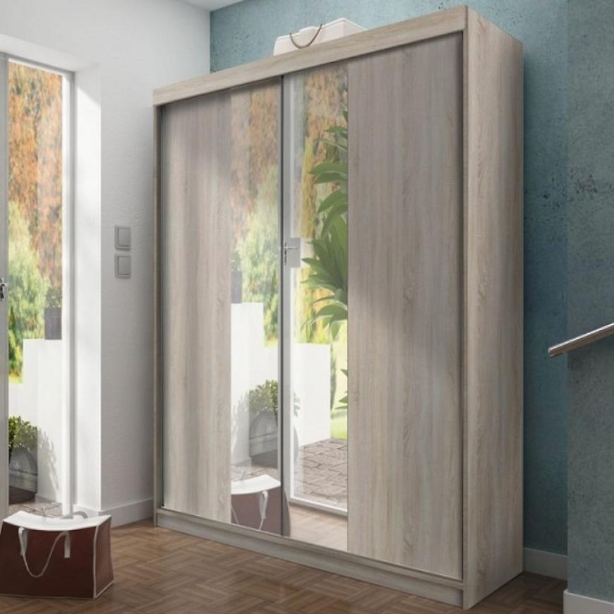 Z szerokością 150 cm, ta dwudrzwiowa szafa z drzwiami przesuwnymi doskonale łączy funkcjonalność z estetyką. Fronty szafy wyróżniają się nie tylko matowym wykończeniem, ale także lustrem umieszczonym na froncie, co dodaje meblowi niepowtarzalnego charakteru i optycznie powiększa przestrzeń. Wzór dębu sonoma sprawia, że szafa staje się nie tylko praktycznym miejscem do przechowywania, ale także estetycznym elementem wnętrza. Szafa Top 18 została zaprojektowana z myślą o maksymalnej funkcjonalności. Dwudrzwiowe drzwi przesuwne pozwalają na oszczędność miejsca, a jednocześnie ułatwiają dostęp do przechowywanych rzeczy.