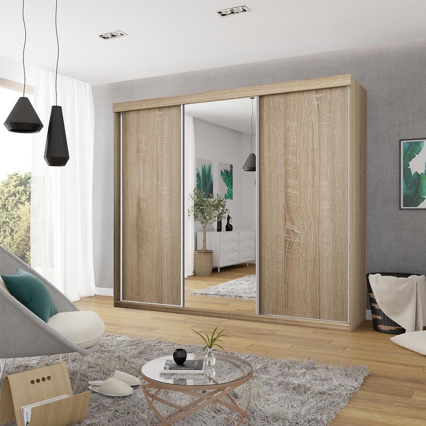 Szafa Top 23 250 w wyrafinowanym dębie sonoma to nie tylko praktyczne miejsce do przechowywania, ale również elegancki element wystroju wnętrza, który doskonale wpisuje się w nowoczesne trendy aranżacyjne. Z trzema drzwiami przesuwnymi, ta szafa zapewnia obszerną przestrzeń przechowywania, jednocześnie dodając charakteru i stylu pomieszczeniu.