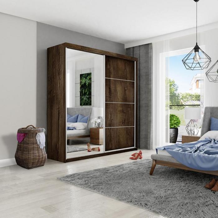 Szafa przesuwna Top z lustrem to praktyczny mebel do sypialni czy przedpokoju, może posłużyć również jako garderoba. Kolor mebla wpasuje się w wiele aranżacji. Będzie pasowała do wnętrz klasycznych jak również do wnętrz nowoczesnych. To duża szafa, która posiada półki oraz drążek do wieszania ubrań, na którym powiesisz nawet długie ubrania. Pojemna szafa to dobre rozwiązanie, żeby schować to czego potrzebujesz. Szafa sprawdzi się z pewnością w danym pomieszczeniu.