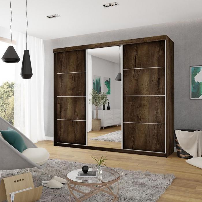 Szafa przesuwna Top z lustrem to praktyczny mebel do sypialni czy przedpokoju, może posłużyć również jako garderoba. Kolor mebla wpasuje się w wiele aranżacji. Będzie pasowała do wnętrz klasycznych jak również do wnętrz nowoczesnych. To duża szafa, która posiada półki oraz drążek do wieszania ubrań, na którym powiesisz nawet długie ubrania. Pojemna szafa to dobre rozwiązanie, żeby schować to czego potrzebujesz. Szafa sprawdzi się z pewnością w danym pomieszczeniu.