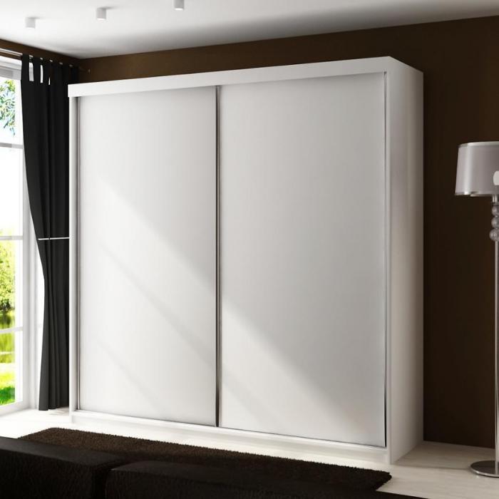 Szafa przesuwna Top to praktyczny mebel do sypialni czy przedpokoju, może posłużyć również jako garderoba. Kolor mebla wpasuje się w wiele aranżacji. Mebel w kolorze białym będzie pasował do wnętrz klasycznych jak również do wnętrz nowoczesnych. To duża szafa, która posiada półki oraz drążek do wieszania ubrań, na którym powiesisz nawet długie ubrania. Pojemna szafa to dobre rozwiązanie, żeby schować to czego potrzebujesz. Szafa sprawdzi się z pewnością w danym pomieszczeniu. Istnieje możliwość dokupienia półek.