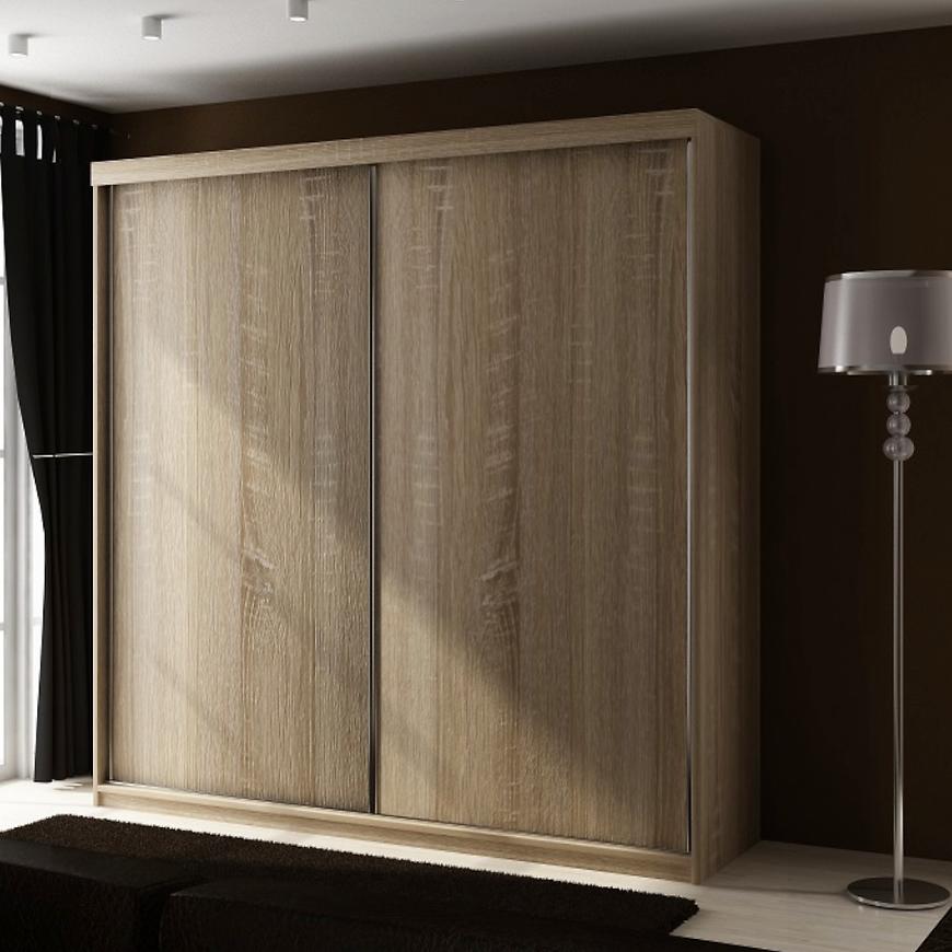 Dwudrzwiowe drzwi przesuwne sprawiają, że korzystanie z szafy staje się łatwe i ergonomiczne, jednocześnie oszczędzając cenną przestrzeń w pomieszczeniu. Fronty drzwi w odcieniu dębu sonoma w matowym wykończeniu dodają wnętrzu subtelnego piękna, a konstrukcja z płyty wiórowej laminowanej gwarantuje trwałość na lata.