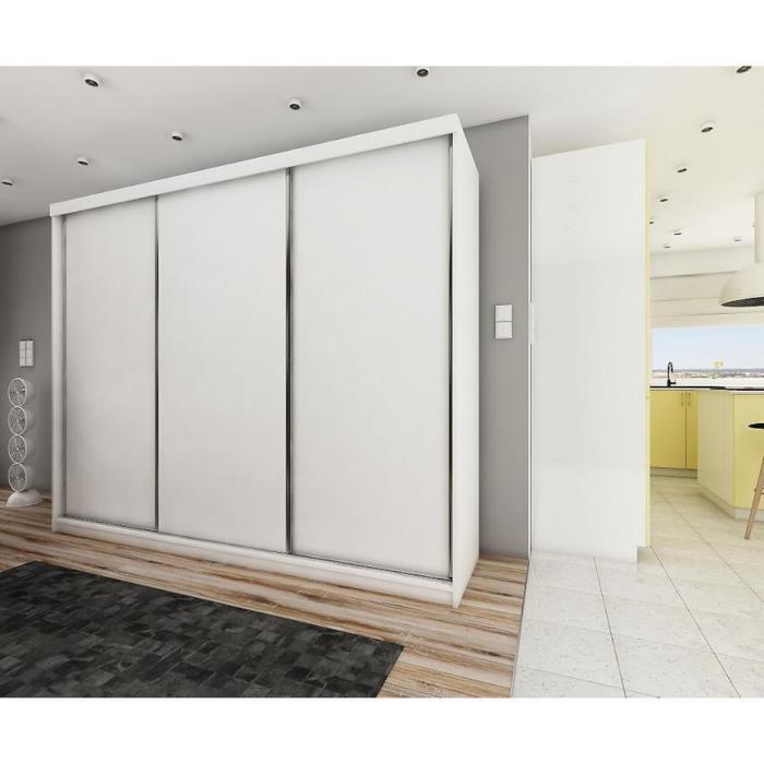 Szafa przesuwna Top to praktyczny mebel do sypialni czy przedpokoju, może posłużyć również jako garderoba. Kolor mebla wpasuje się w wiele aranżacji. Mebel w kolorze białym będzie pasował do wnętrz klasycznych jak również do wnętrz nowoczesnych. To duża szafa, która posiada półki oraz drążek do wieszania ubrań, na którym powiesisz nawet długie ubrania. Pojemna szafa to dobre rozwiązanie, żeby schować to czego potrzebujesz. Szafa sprawdzi się z pewnością w danym pomieszczeniu. Istnieje możliwość dokupienia półek.