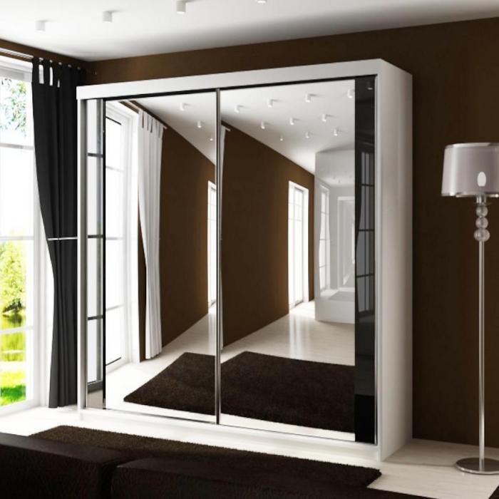 Szafa przesuwna Top z lustrem to praktyczny mebel do sypialni czy przedpokoju, może posłużyć również jako garderoba. Kolor mebla wpasuje się w wiele aranżacji. Mebel w kolorze białym będzie pasował do wnętrz klasycznych jak również do wnętrz nowoczesnych. To duża szafa, która posiada półki oraz drążek do wieszania ubrań, na którym powiesisz nawet długie ubrania. Pojemna szafa to dobre rozwiązanie, żeby schować to czego potrzebujesz. Szafa sprawdzi się z pewnością w danym pomieszczeniu. Istnieje możliwość dokupienia półek.