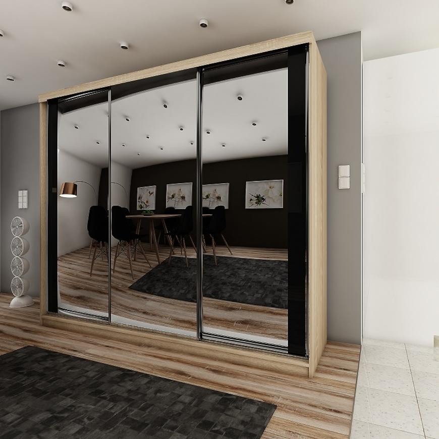 Trzydrzwiowe drzwi przesuwne, z subtelnym dodatkiem lustra i dekoracyjnymi elementami, nadają szafie niepowtarzalny charakter. Kolorystyka dębu sonoma dominuje zarówno na frontach, jak i korpusie, tworząc spójną i harmonijną całość. Matowe wykończenie frontów z płyty wiórowej laminowanej podkreśla nowoczesny design, jednocześnie gwarantując trwałość i odporność na zarysowania.