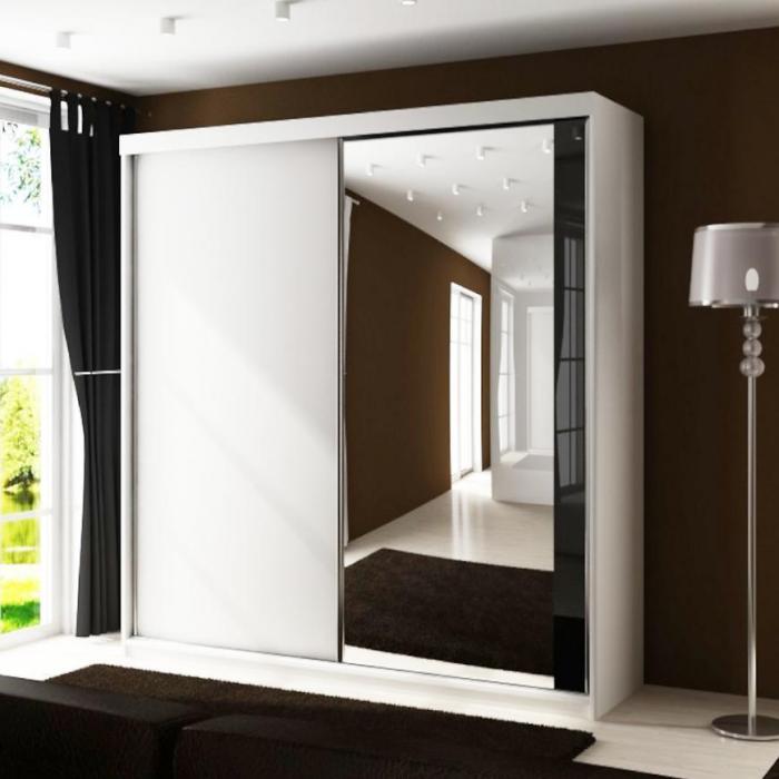 Szafa przesuwna Top z lustrem to praktyczny mebel do sypialni czy przedpokoju, może posłużyć również jako garderoba. Kolor mebla wpasuje się w wiele aranżacji. Mebel w kolorze białym będzie pasował do wnętrz klasycznych jak również do wnętrz nowoczesnych. To duża szafa, która posiada półki oraz drążek do wieszania ubrań, na którym powiesisz nawet długie ubrania. Pojemna szafa to dobre rozwiązanie, żeby schować to czego potrzebujesz. Szafa sprawdzi się z pewnością w danym pomieszczeniu. Istnieje możliwość dokupienia półek.