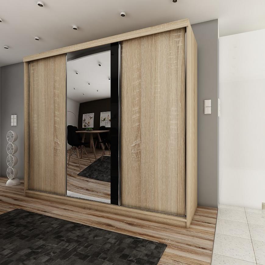 Trzydrzwiowe drzwi przesuwne, z subtelnym dodatkiem lustra i dekoracyjnymi elementami, nadają szafie niepowtarzalny charakter. Kolorystyka dębu sonoma dominuje zarówno na frontach, jak i korpusie, tworząc spójną i harmonijną całość. Matowe wykończenie frontów z płyty wiórowej laminowanej podkreśla nowoczesny design, jednocześnie gwarantując trwałość i odporność na zarysowania.
