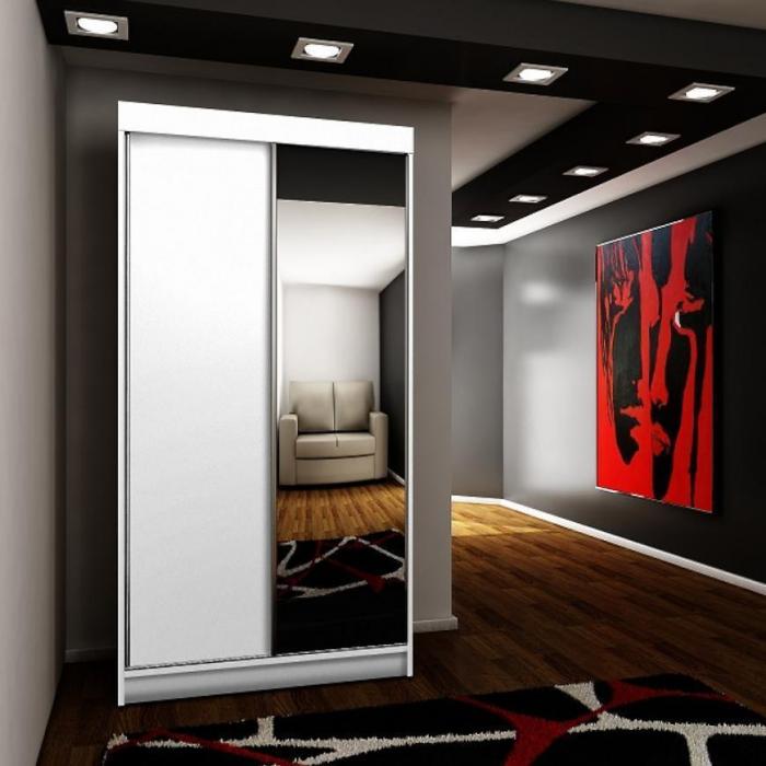 Szafa przesuwna Top z lustrem to praktyczny mebel do sypialni czy przedpokoju. Kolor mebla wpasuje się w wiele aranżacji. Mebel w kolorze białym będzie pasował do wnętrz klasycznych jak również do wnętrz nowoczesnych. To szafa dwudrzwiowa, która posiada półki oraz drążek do wieszania ubrań, na którym powiesisz nawet długie ubrania. Pojemna szafa to dobre rozwiązanie, żeby schować to czego potrzebujesz. Szafa sprawdzi się z pewnością w danym pomieszczeniu. Istnieje możliwość dokupienia półek.