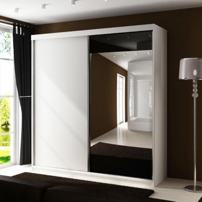 Szafa przesuwna Top z lustrem to praktyczny mebel do sypialni czy przedpokoju, może posłużyć również jako garderoba. Kolor mebla wpasuje się w wiele aranżacji. Mebel w kolorze białym będzie pasował do wnętrz klasycznych jak również do wnętrz nowoczesnych. To duża szafa, która posiada półki oraz drążek do wieszania ubrań, na którym powiesisz nawet długie ubrania. Pojemna szafa to dobre rozwiązanie, żeby schować to czego potrzebujesz. Szafa sprawdzi się z pewnością w danym pomieszczeniu. Istnieje możliwość dokupienia półek.