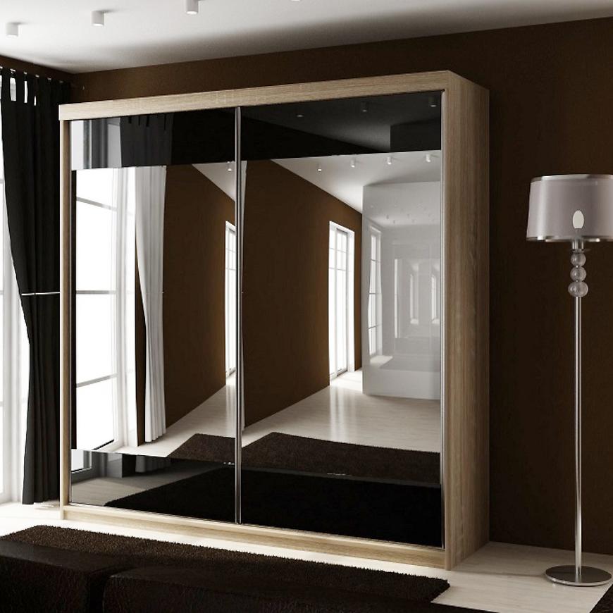 Drzwi dwudrzwiowe, wykonane z przesuwnym mechanizmem, nie tylko dodają praktyczności, ale również oszczędzają miejsce, umożliwiając łatwy dostęp do wnętrza szafy. Dodatkowo, fronty drzwi są ozdobione efektownym lustrem i dekorem, nadając pomieszczeniu nie tylko funkcjonalności, ale również optycznej przestrzeni.