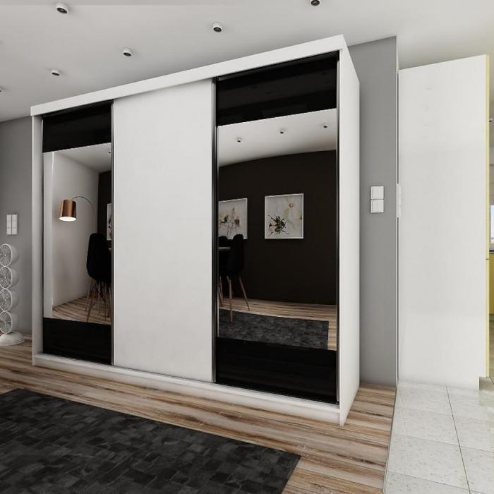Szafa przesuwna Top z lustrem to praktyczny mebel do sypialni czy przedpokoju, może posłużyć również jako garderoba. Kolor mebla wpasuje się w wiele aranżacji. Mebel w kolorze białym będzie pasował do wnętrz klasycznych jak również do wnętrz nowoczesnych. To duża szafa, która posiada półki oraz drążek do wieszania ubrań, na którym powiesisz nawet długie ubrania. Pojemna szafa to dobre rozwiązanie, żeby schować to czego potrzebujesz. Szafa sprawdzi się z pewnością w danym pomieszczeniu. Istnieje możliwość dokupienia półek.