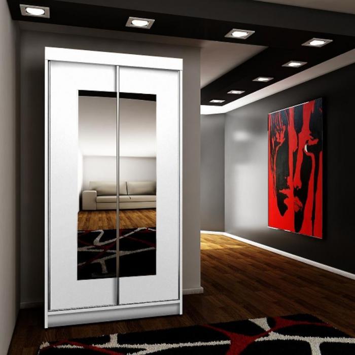 Szafa przesuwna Top z lustrem to praktyczny mebel do sypialni czy przedpokoju. Kolor mebla wpasuje się w wiele aranżacji. Mebel w kolorze białym będzie pasował do wnętrz klasycznych jak również do wnętrz nowoczesnych. To szafa dwudrzwiowa, która posiada półki oraz drążek do wieszania ubrań, na którym powiesisz nawet długie ubrania. Pojemna szafa to dobre rozwiązanie, żeby schować to czego potrzebujesz. Szafa sprawdzi się z pewnością w danym pomieszczeniu.