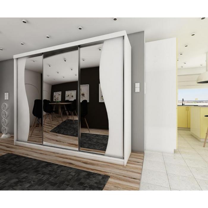 Szafa przesuwna Top z lustrem to praktyczny mebel do sypialni czy przedpokoju, może posłużyć również jako garderoba. Kolor mebla wpasuje się w wiele aranżacji. Mebel w kolorze białym będzie pasował do wnętrz klasycznych jak również do wnętrz nowoczesnych. To duża szafa, która posiada półki oraz drążek do wieszania ubrań, na którym powiesisz nawet długie ubrania. Szafa na ubrania z pewnością sprawdzi się w danym pomieszczeniu. Pojemna szafa to dobre rozwiązanie, żeby schować to czego potrzebujesz.