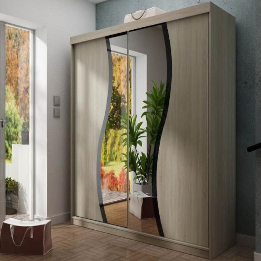 Fronty szafy prezentują się wyjątkowo dzięki zastosowaniu wysokiej jakości płyty wiórowej laminowanej, która została matowo wykończona. Kolor dębu sonoma dodaje wnętrzu ciepła, a jednocześnie harmonijnie współgra z nowoczesnym stylem. Wyposażona w dwudrzwiowe drzwi z lustrem umieszczonym na froncie, co nie tylko ułatwia codzienne przygotowywanie się, ale także optycznie powiększa przestrzeń i dodaje lekkości aranżacji.