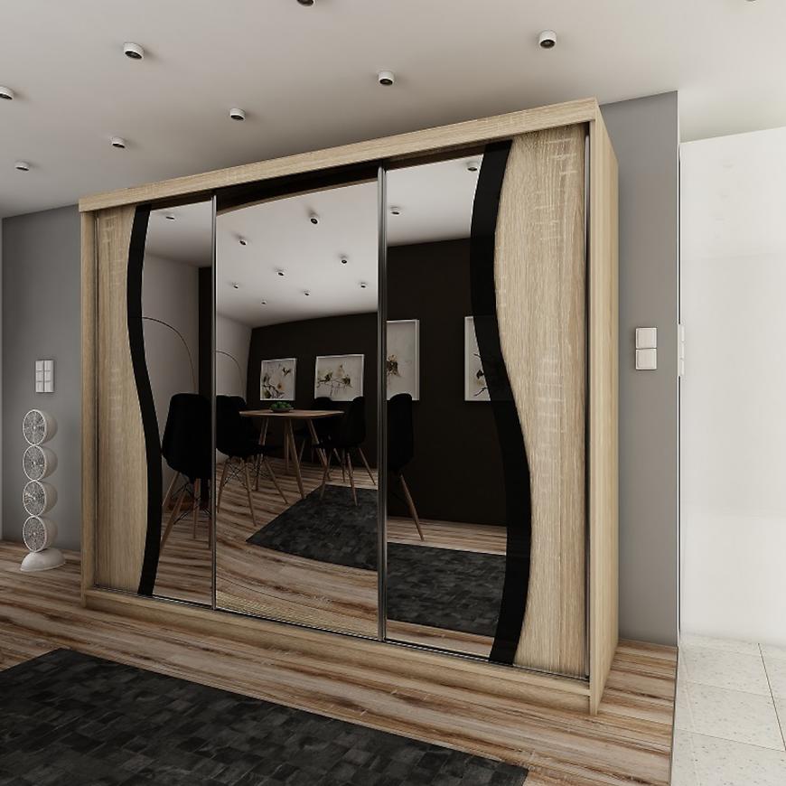 Trzydrzwiowe drzwi przesuwne nie tylko ułatwiają dostęp do wnętrza szafy, ale także nadają całości nowoczesny i elegancki charakter. Lustro i dekor umieszczone na froncie drzwi dodaje wnętrzu przestrzeni i sprawia, że codzienne przygotowywanie się staje się wyjątkowym doświadczeniem.