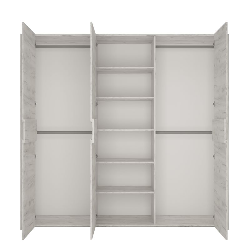 Wnętrze szafy Angel Typ 22 zostało zaprojektowane tak, aby maksymalnie wykorzystać przestrzeń. Trzydrzwiowy układ zapewnia wygodny dostęp do każdej części mebla – możesz z łatwością uporządkować ubrania, dodatki czy inne przedmioty. Przemyślane rozmieszczenie półek i drążków pozwala na funkcjonalne zorganizowanie garderoby, zarówno dla jednej osoby, jak i pary.
