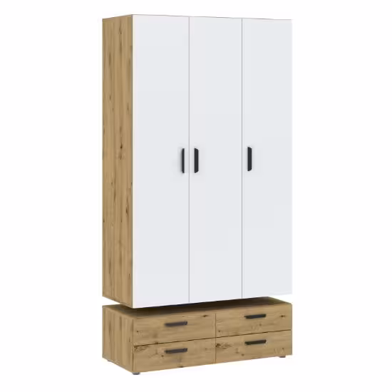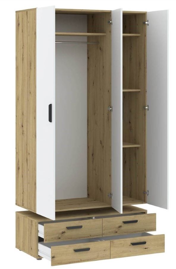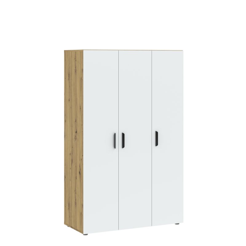 Korpus szafy jest wykończony w eleganckim wybarwieniu dąb artisan, który dodaje wnętrzu ciepła i naturalnego uroku. Fronty drzwi w kolorze biały mat wprowadzają do pomieszczenia świeżość i nowoczesność, tworząc harmonijny kontrast z drewnianym korpusem. Trzydrzwiowa konstrukcja szafy zapewnia łatwy dostęp do jej wnętrza, a uchylne drzwi umożliwiają wygodne otwieranie i zamykanie.