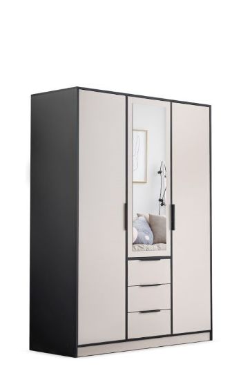 Szafa Lati D3 zachwyca połączeniem kontrastowych barw – czarny korpus idealnie komponuje się z kaszmirowo-beżowymi frontami, tworząc stylowy i ponadczasowy wygląd. Czarne uchwyty podkreślają nowoczesny charakter mebla, sprawiając, że pasuje on do różnych aranżacji wnętrz.
