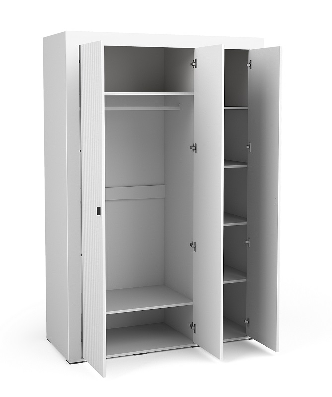 Szafa trzydrzwiowa Mossa MO2 to stylowy i funkcjonalny element wyposażenia wnętrz, który świetnie wpisuje się w nowoczesne aranżacje. Jej minimalistyczny design i przemyślana konstrukcja czynią ją idealnym wyborem zarówno do pokoju dziennego, młodzieżowego, jak i sypialni. Dzięki uniwersalnemu wyglądowi w białym macie z efektem prążkowania, szafa Mossa MO2 wprowadza do pomieszczeń poczucie lekkości, czystości i przestronności, jednocześnie oferując wiele praktycznych rozwiązań do przechowywania.
