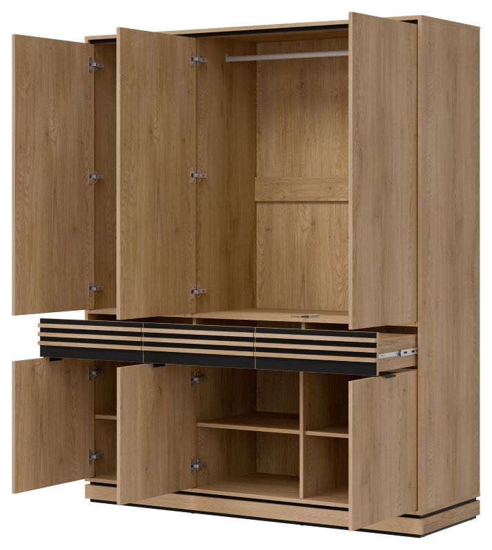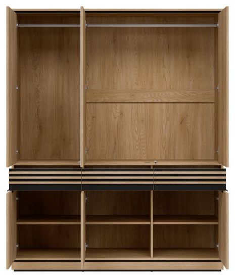 Pozostałe fronty wyposażono w metalowe uchwyty w kolorze czarnym, które doskonale współgrają z nowoczesnym charakterem mebli, a zawiasy z systemem cichego domyku zapewniają bezgłośne zamykanie i zwiększoną wygodę użytkowania.