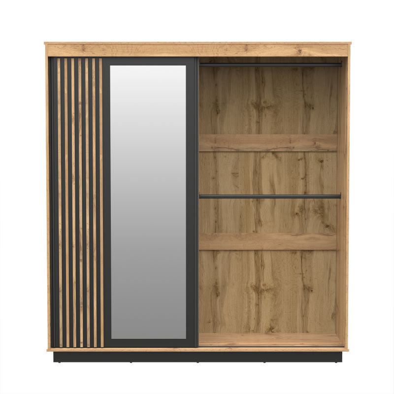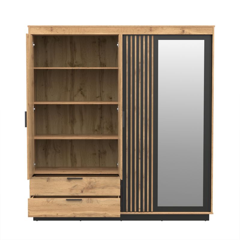 Model Sole LA32 został zaprojektowany z myślą o maksymalnej wygodzie użytkowania. To szafa trzydrzwiowa, w której lewa strona obejmuje dwoje drzwi uchylnych i dwie praktyczne szuflady, idealne na drobiazgi, bieliznę lub akcesoria. Prawa strona to drzwi przesuwne z dużym lustrem i efektownymi lamelami w kolorze czarny mat.