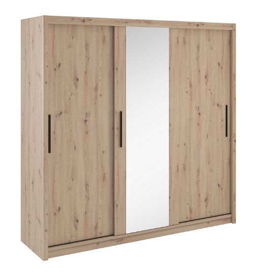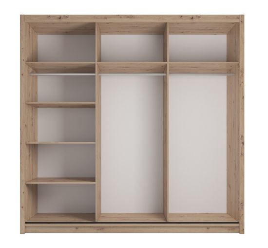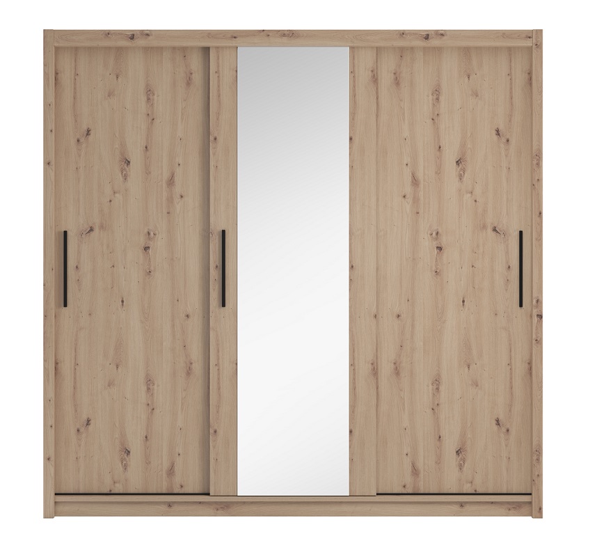 Lustro na środkowych drzwiach nie tylko optycznie powiększa przestrzeń, ale także dodaje elegancji i funkcjonalności. Szafa Vesti 220 jest wyposażona w drzwi przesuwne, które są idealnym rozwiązaniem dla wnętrz o ograniczonej przestrzeni. Fronty i korpus wykonane z wysokiej jakości płyty laminowanej gwarantują trwałość oraz odporność na codzienne użytkowanie, a czarne uchwyty i prowadnice z tworzywa sztucznego dopełniają jej nowoczesny design.