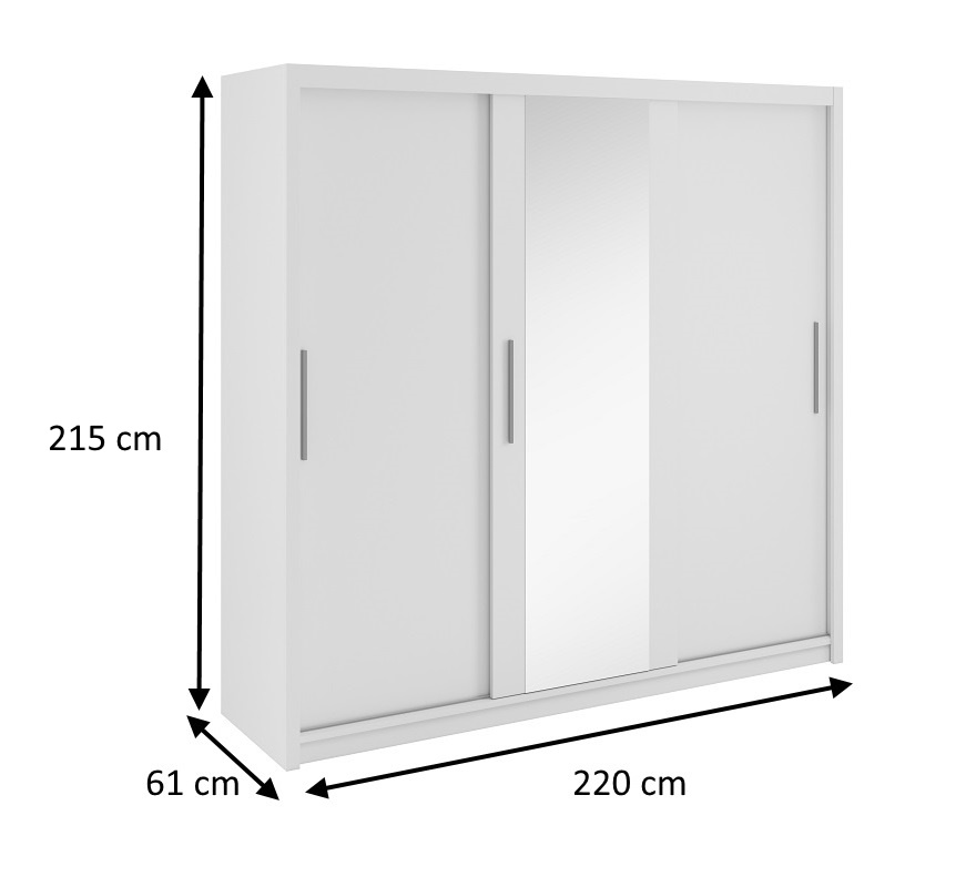 Szafa ma szerokość 220 cm i głębokość 61 cm, co zapewnia dużo miejsca do przechowywania ubrań, butów i akcesoriów. Przesuwne drzwi nie tylko ułatwiają codzienne użytkowanie, ale też pozwalają zaoszczędzić przestrzeń – idealne do mniejszych pomieszczeń. Lustro umieszczone na środkowym froncie nie tylko spełnia funkcję praktyczną, ale też optycznie powiększa przestrzeń i rozjaśnia wnętrze.