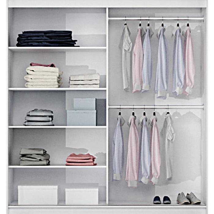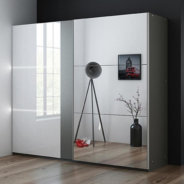 Szafa na ubrania Tunis z lustrem to praktyczny mebel do sypialni czy przedpokoju, może posłużyć również jako garderoba. Kolor mebla biały połysk i grafit wpasuje się w wiele aranżacji. Będzie pasowała do wnętrz klasycznych jak również do wnętrz nowoczesnych. Szafa sprawdzi się w danym pomieszczeniu. To duża szafa, która posiada półki oraz drążki do wieszania ubrań. Pojemna szafa to dobre rozwiązanie, żeby schować to czego potrzebujesz.