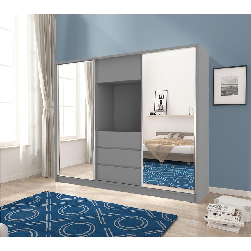 Szafa TV 250 w odcieniach grafitu z lustrem to nie tylko praktyczne rozwiązanie do przechowywania sprzętu elektronicznego, ale również efektowny element wystroju wnętrza. Jej dwudrzwiowe drzwi przesuwne gwarantują wygodny dostęp, jednocześnie pozwalając na oszczędność miejsca w pomieszczeniu.
