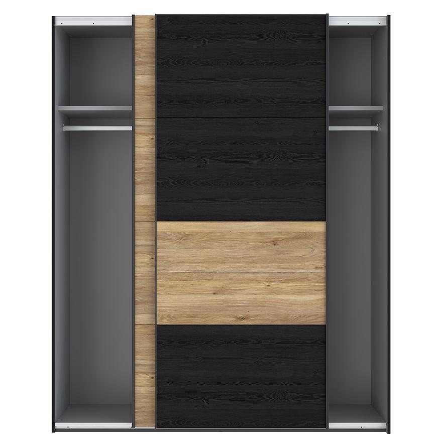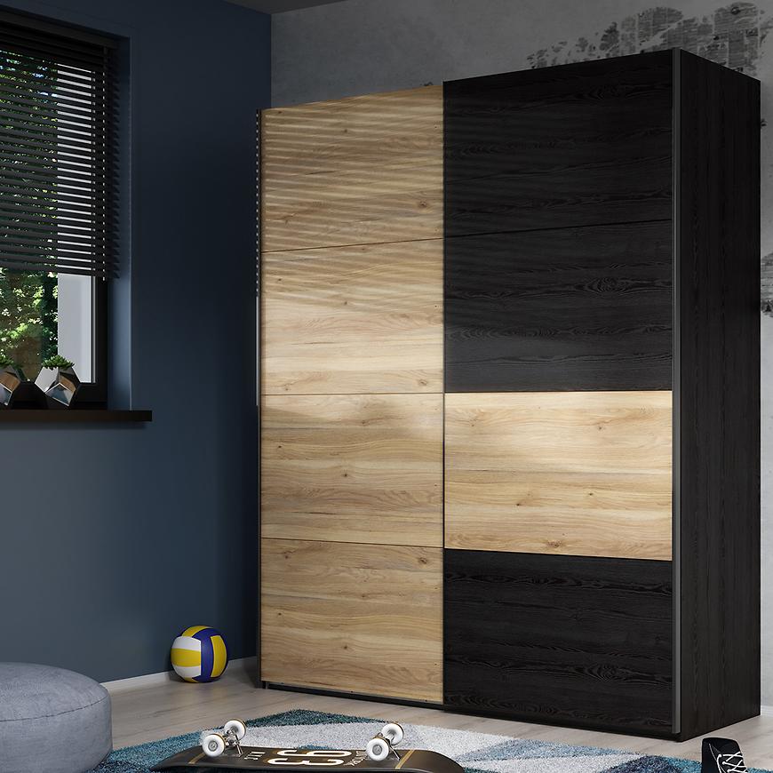 Szafa została wykonana z wytrzymałej płyty wiórowej laminowanej, co gwarantuje jej trwałość i solidność. Wykończenie szafy prezentuje matowe wybarwienie, które nadaje meblowi eleganckiego i ponadczasowego charakteru. Kolorystyka w odcieniach dąbu Mauvella i dąbu Cabezone tworzy harmonijną kompozycję, która wprowadza przytulny i nowoczesny klimat do Twojego wnętrza.