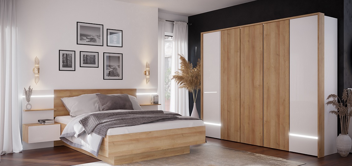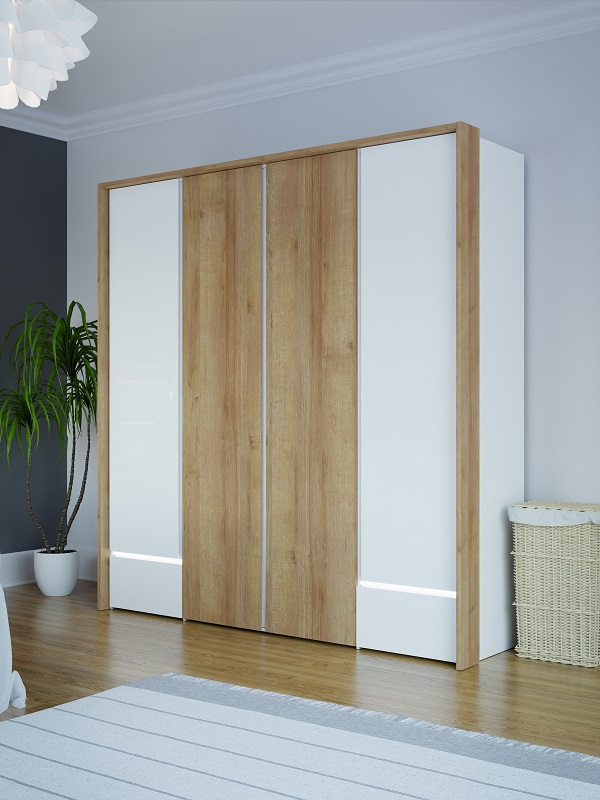 Jednym z głównych atutów tej szafy jest jej nowoczesny i skandynawski design. Kombinacja koloru białego i dębu riviera nadaje jej elegancji i lekkości, dzięki czemu doskonale wpisuje się w różnorodne aranżacje wnętrz. Biała płyta na frontach w połysku nadaje szafie subtelny blask, który przyciąga uwagę i dodaje jej wyjątkowego uroku. Szafa Lenybelardo to również mebel, który dba o najmniejsze detale. Rolę uchwytów pełnią frezowania we frontach, co nadaje jej minimalistycznego, eleganckiego charakteru. To właśnie te subtelne elementy sprawiają, że szafa staje się prawdziwą ozdobą każdego pomieszczenia.