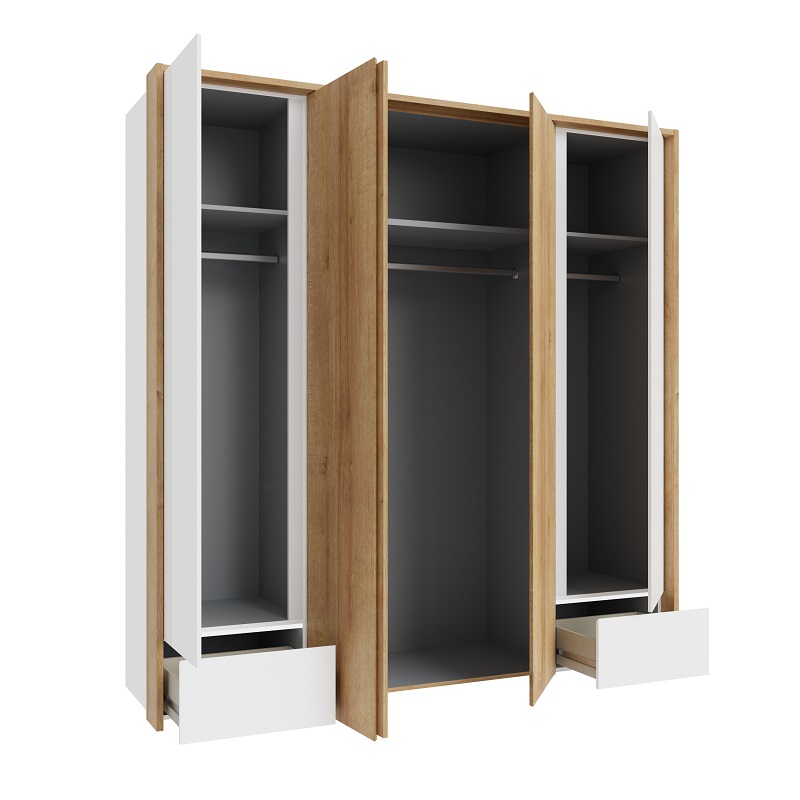 Ta szafa to nie tylko element dekoracyjny - to przede wszystkim doskonałe miejsce do przechowywania. Wnętrze szafy skrywa trzy drążki ubraniowe, które pomieszczą wiele ubrań w jednym miejscu. Trzy półki zamontowane na stałe pozwalają na uporządkowane przechowywanie innych przedmiotów, takich jak buty, torebki czy pościel. Dodatkowo, dwie szuflady zapewniają dodatkową przestrzeń do przechowywania mniejszych przedmiotów.