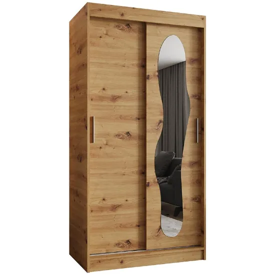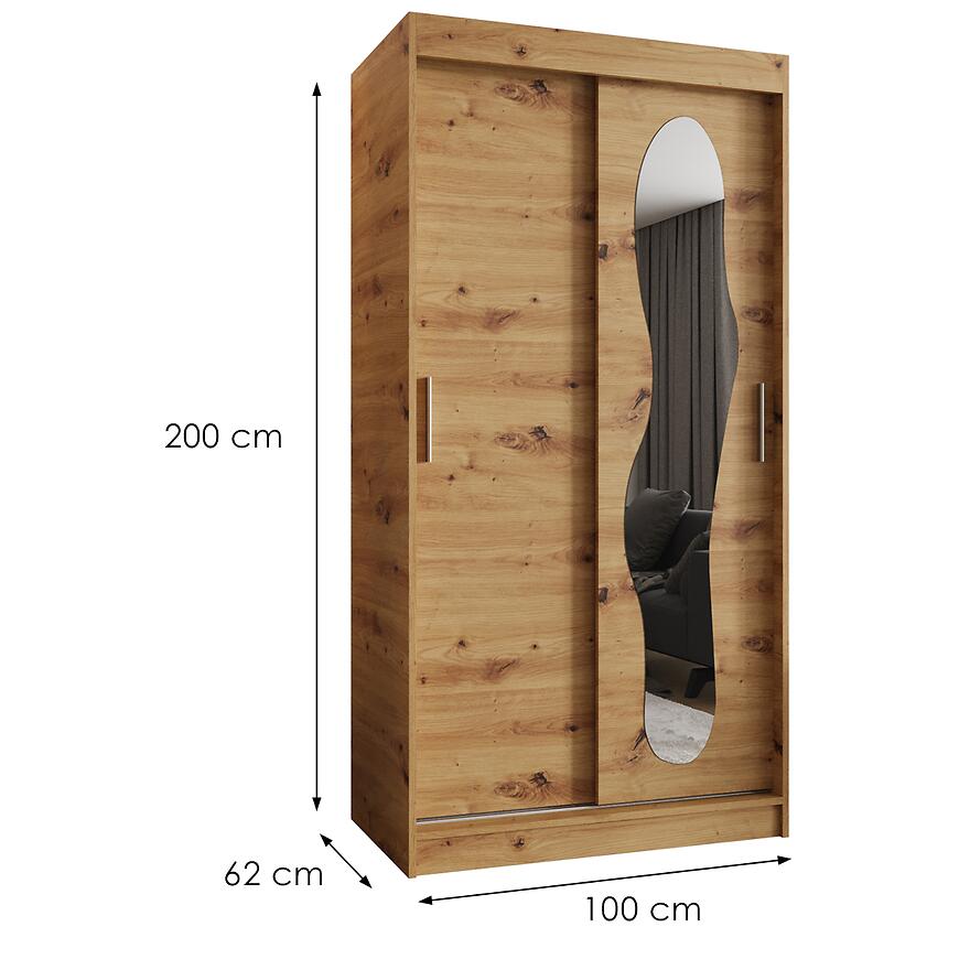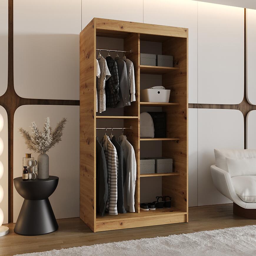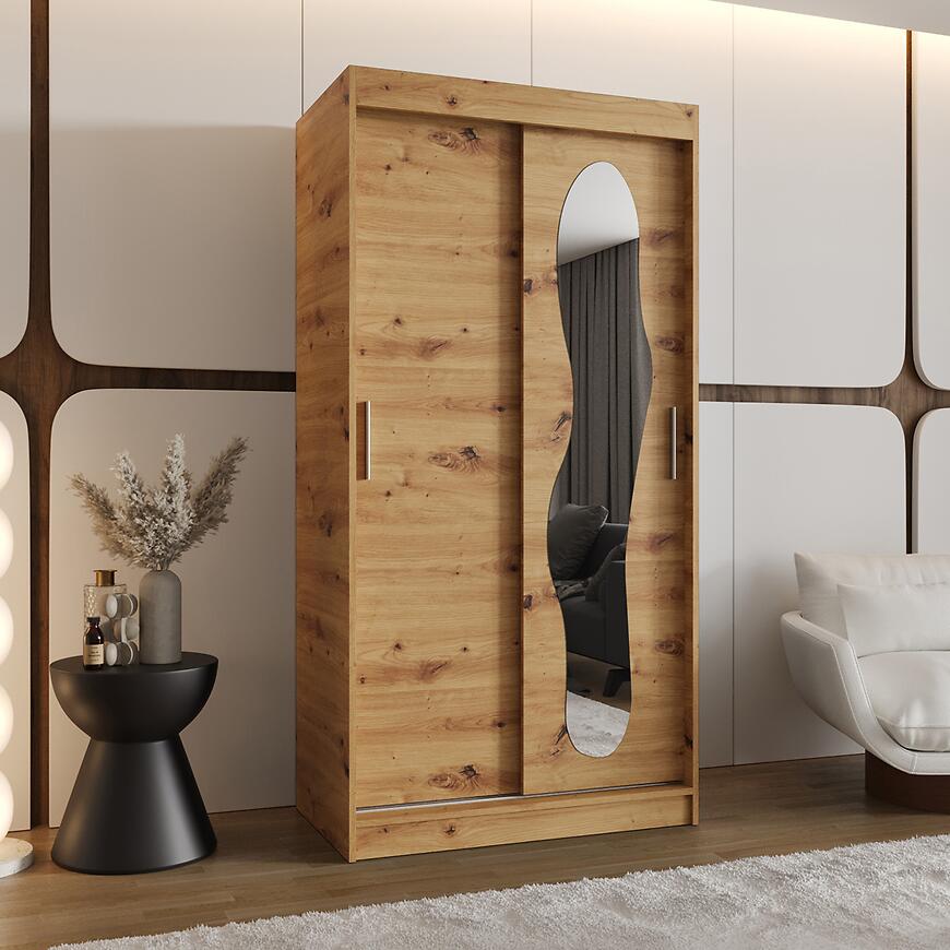 Szafa Ultra 100 w kolorze artisan to idealne rozwiązanie dla osób poszukujących nowoczesnego mebla o mniejszych wymiarach, który nie traci funkcjonalności. Dwudrzwiowa konstrukcja z drzwiami przesuwnymi oraz wbudowanym lustrem umożliwia wygodny dostęp do ubrań, jednocześnie oszczędzając miejsce w pomieszczeniu. Jasne drewnopodobne wybarwienie frontów i korpusu optycznie rozjaśnia wnętrze i wprowadza przytulny, naturalny klimat.