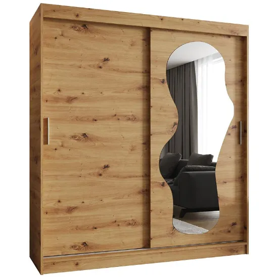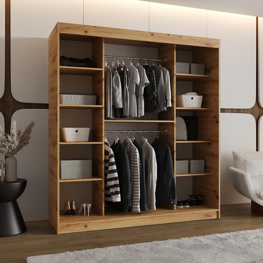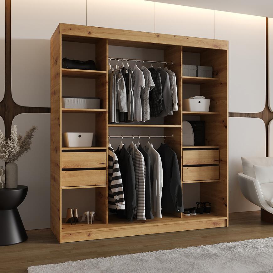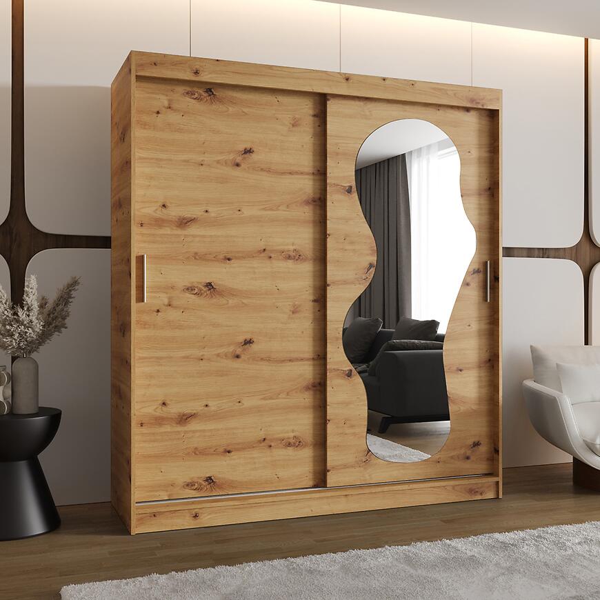 Szafa Ultra 180 w kolorze artisan to funkcjonalny i stylowy mebel do nowoczesnej sypialni. Dwudrzwiowa konstrukcja z drzwiami przesuwnymi oraz dużym lustrem pozwala oszczędzić miejsce, a jednocześnie wprowadza poczucie przestronności i elegancji do wnętrza. Jasne, drewnopodobne wybarwienie frontów w połączeniu z korpusem w odcieniu dąb artisan nadaje szafie naturalny, ciepły i nowoczesny charakter, idealny do aranżacji w stylu skandynawskim i minimalistycznym.