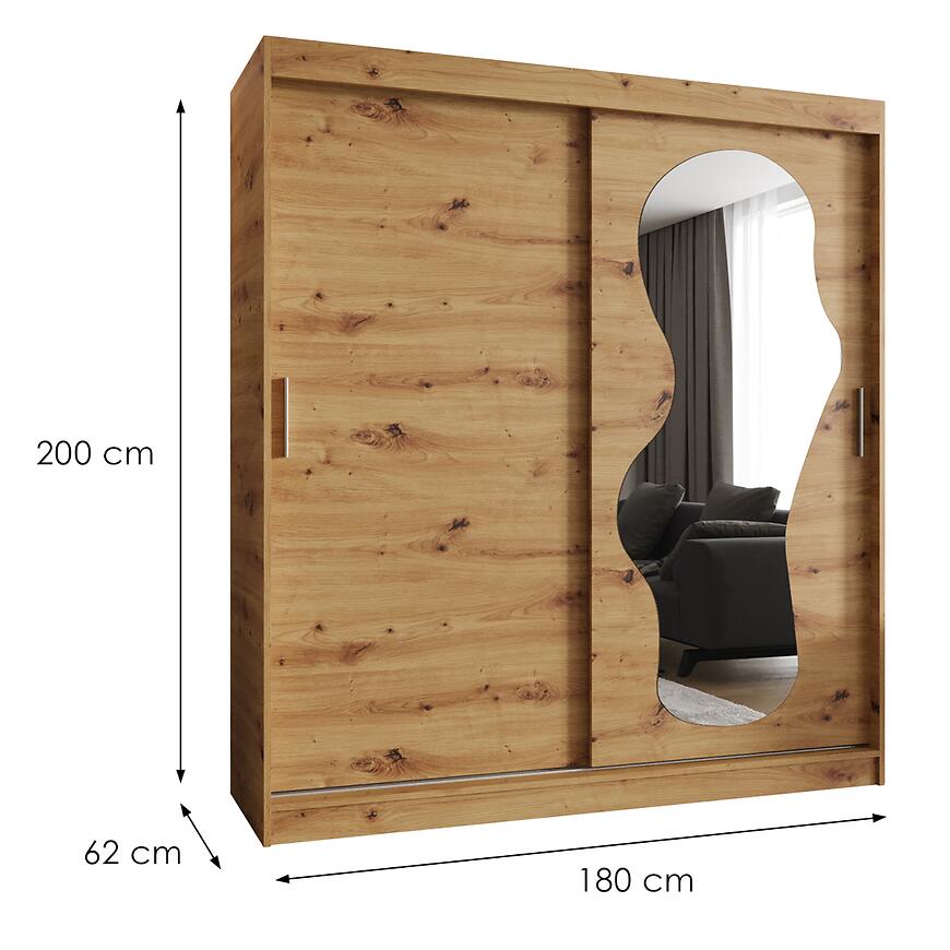 Wymiary szafy – wysokość 200 cm, szerokość 180 cm i głębokość 62 cm – zapewniają przestronną powierzchnię do przechowywania ubrań, dodatków i innych akcesoriów. Drzwi przesuwne ułatwiają dostęp do wnętrza, a lustro optycznie powiększa przestrzeń, dodając jej lekkości i stylowego akcentu.
